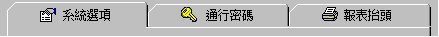 在「系統設定」視窗上有三個標籤頁(如下圖),分別是[系統選項]、[通行密碼]、以及[報表抬頭]。