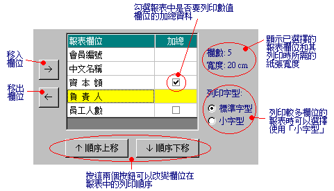 在這個步驟您可以:選擇報表的「報表欄位」:請參考下圖的說明。