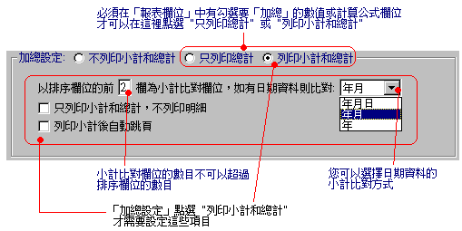 請注意: 在未選擇排序欄位之前,無法進行報表的小計設定。